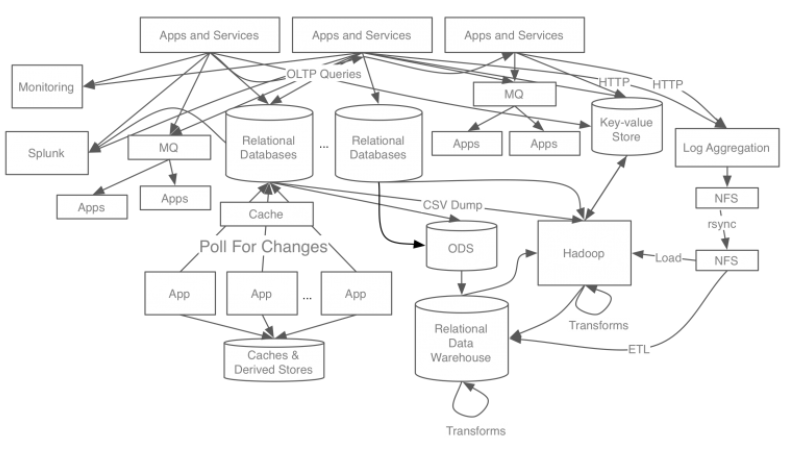 카프카는 2011년 미국 링크드인(Linkedin) 에서 개발했는데, 카프카 개발 전의 링크드인 데이터 처리 시스템을 보자.