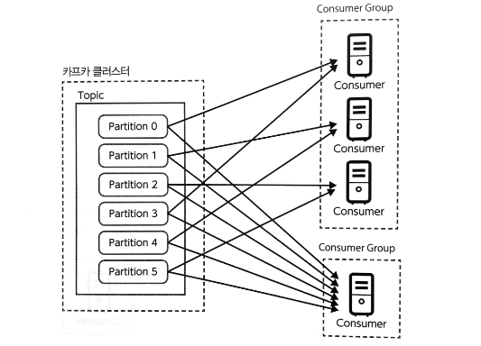 - 컨슈머가 카프카 클러스터에서 메시지를 얻어 처리할 때, 컨슈머는 컨슈머 그룹 이라 불리우는 하나 이상의 컨슈머들로 이루어진 그룹을 형성하여 메시지를 얻는다.