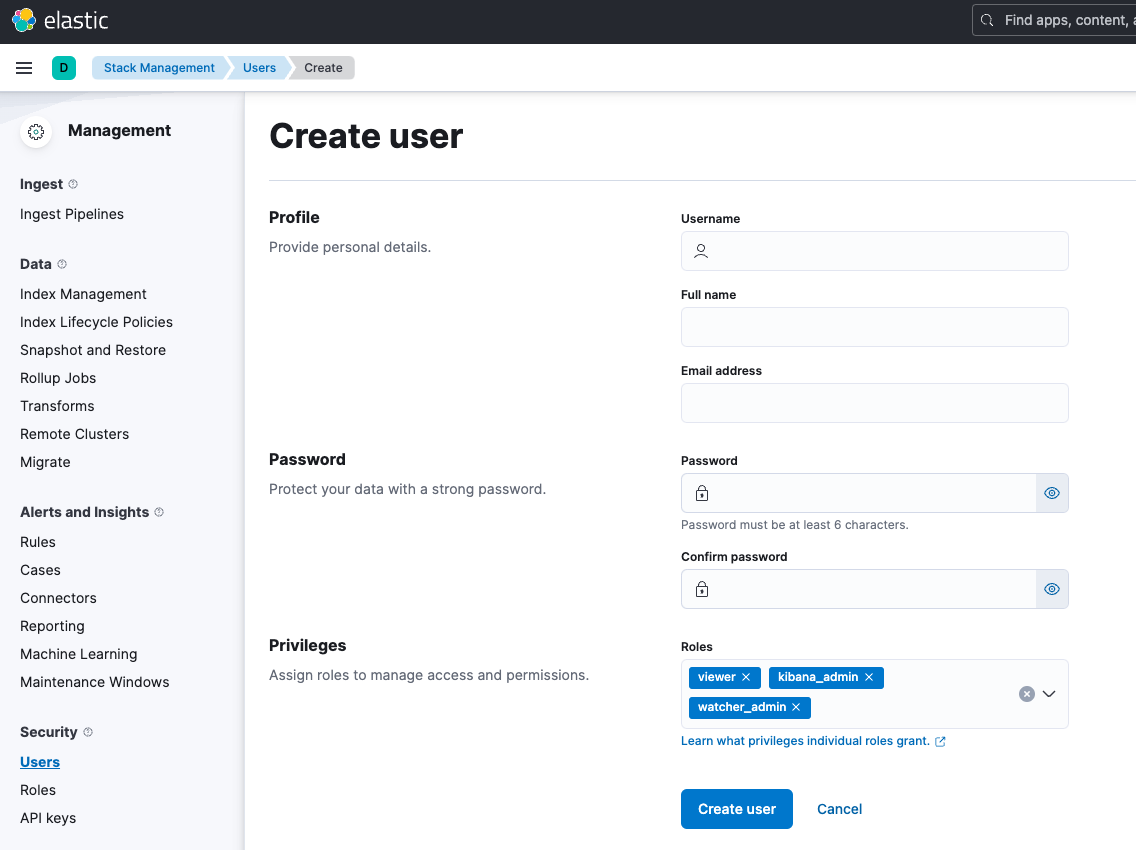 - viewer, kibana_admin, watcher_admin: 이정도의 권한이면 대시보드 추가 및 보기부터 왠만한건 다 할 수 있다.