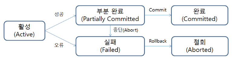 트랜잭션의 연산과정의 단계를 도식화하고 각각의 단계의 상태를 그림과 같이 정리할 수 있는데, 개별 상태에 대한 상세는 다음과 같다.