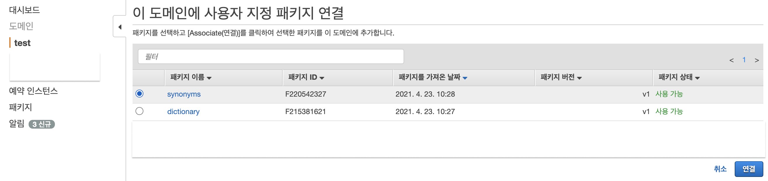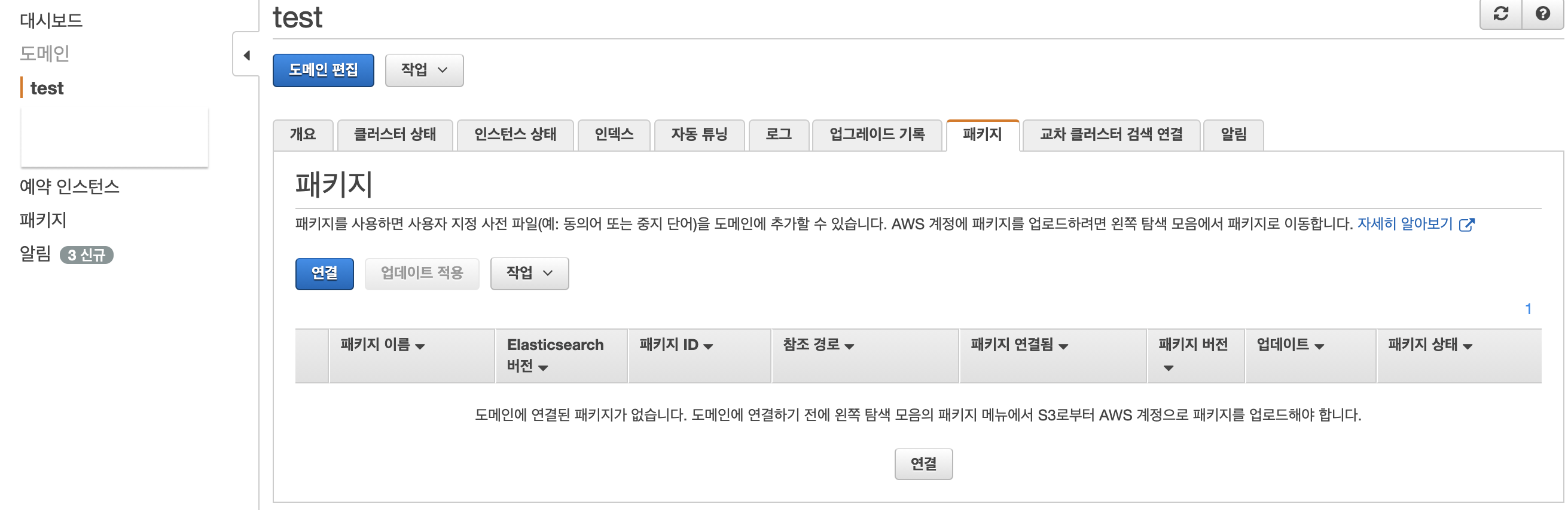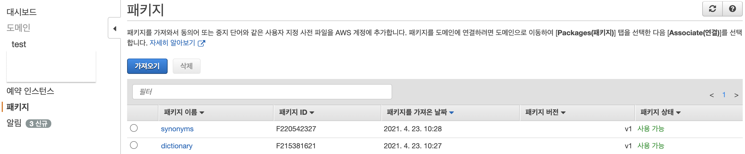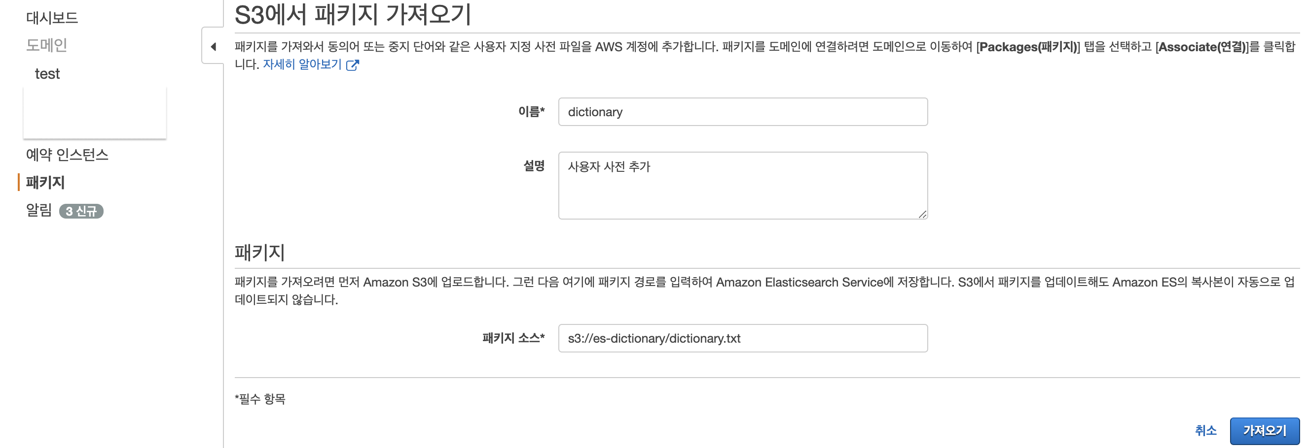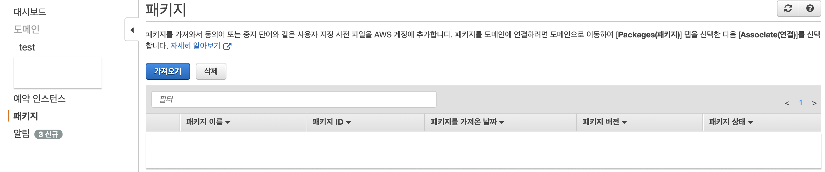 1) AWS Elasticsearch Service > 패키지 > [가져오기] 버튼 클릭