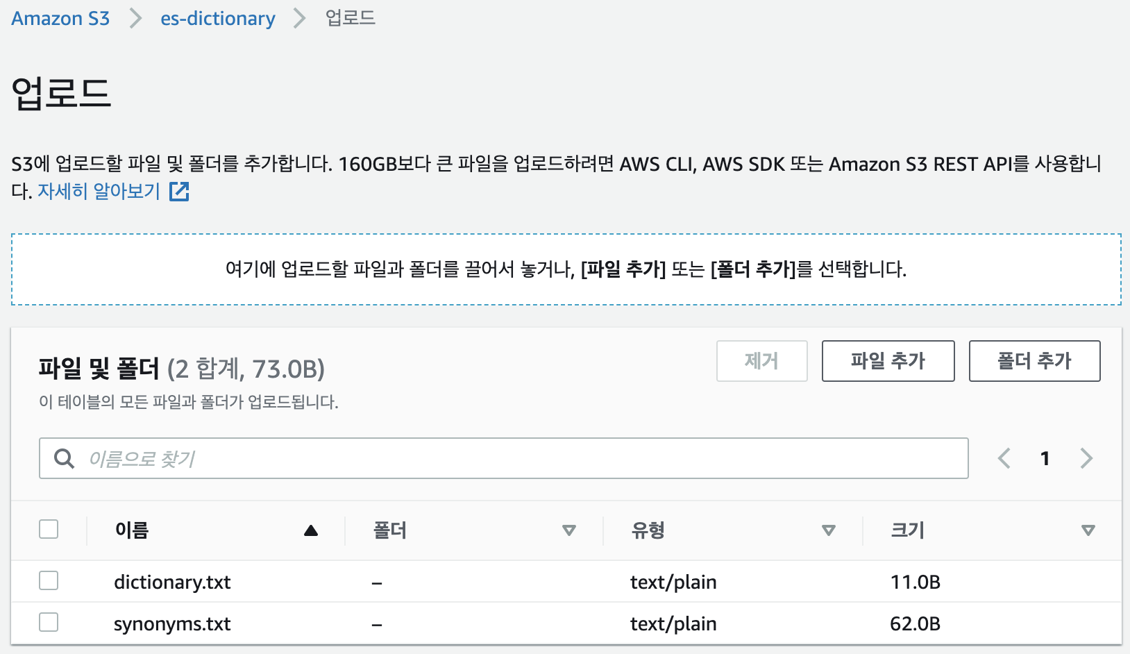 3. 위에서 만든 사용자 사전 파일을 AWS S3 에 업로드한다.