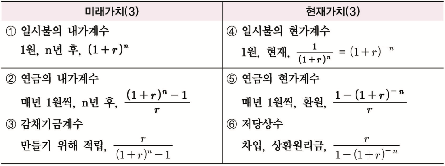 - 현재가치(현가)의 계산공식: 일시불의 현재가치계수, 연금의 현재가치계수, 저당상수