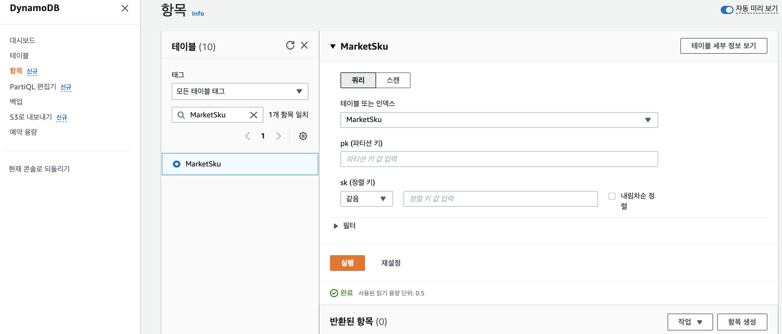 1. DynamoDB > [항목] 클릭 > 테이블 클릭 > [항목 생성] 버튼 클릭