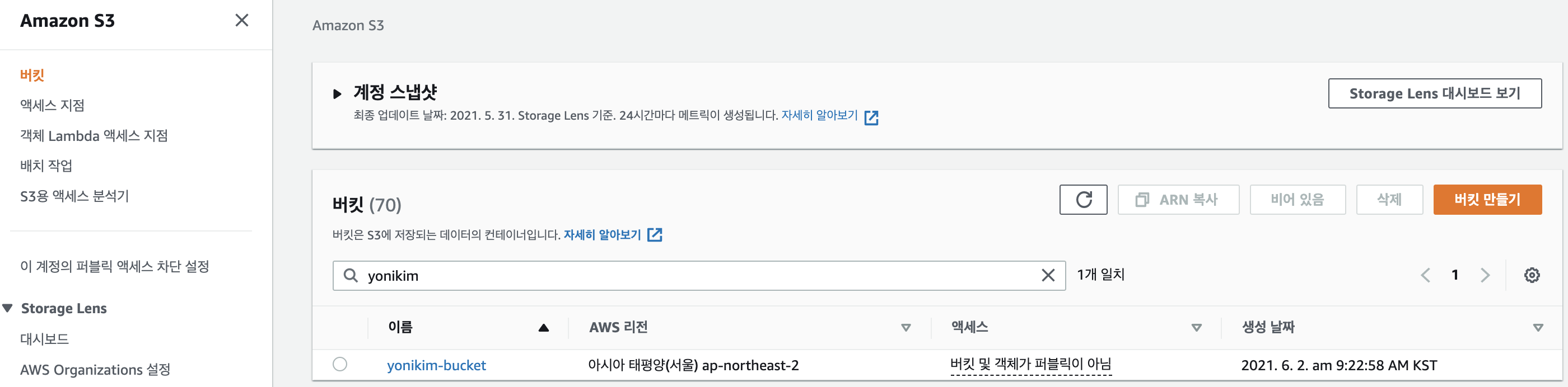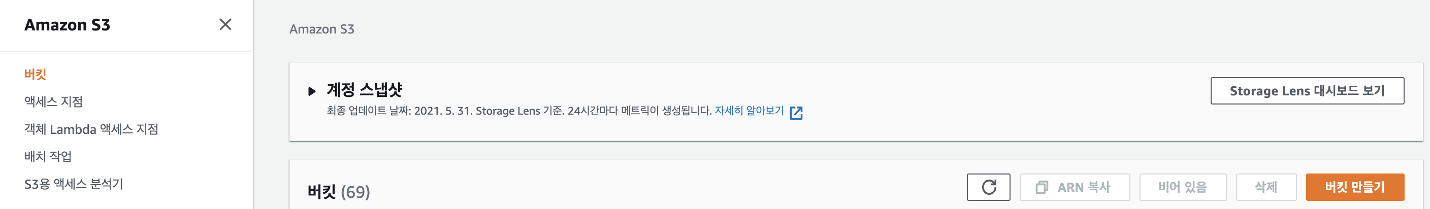 3. 세팅 후 [버킷 만들기] 버튼을 클릭하면 버킷이 생성된다.