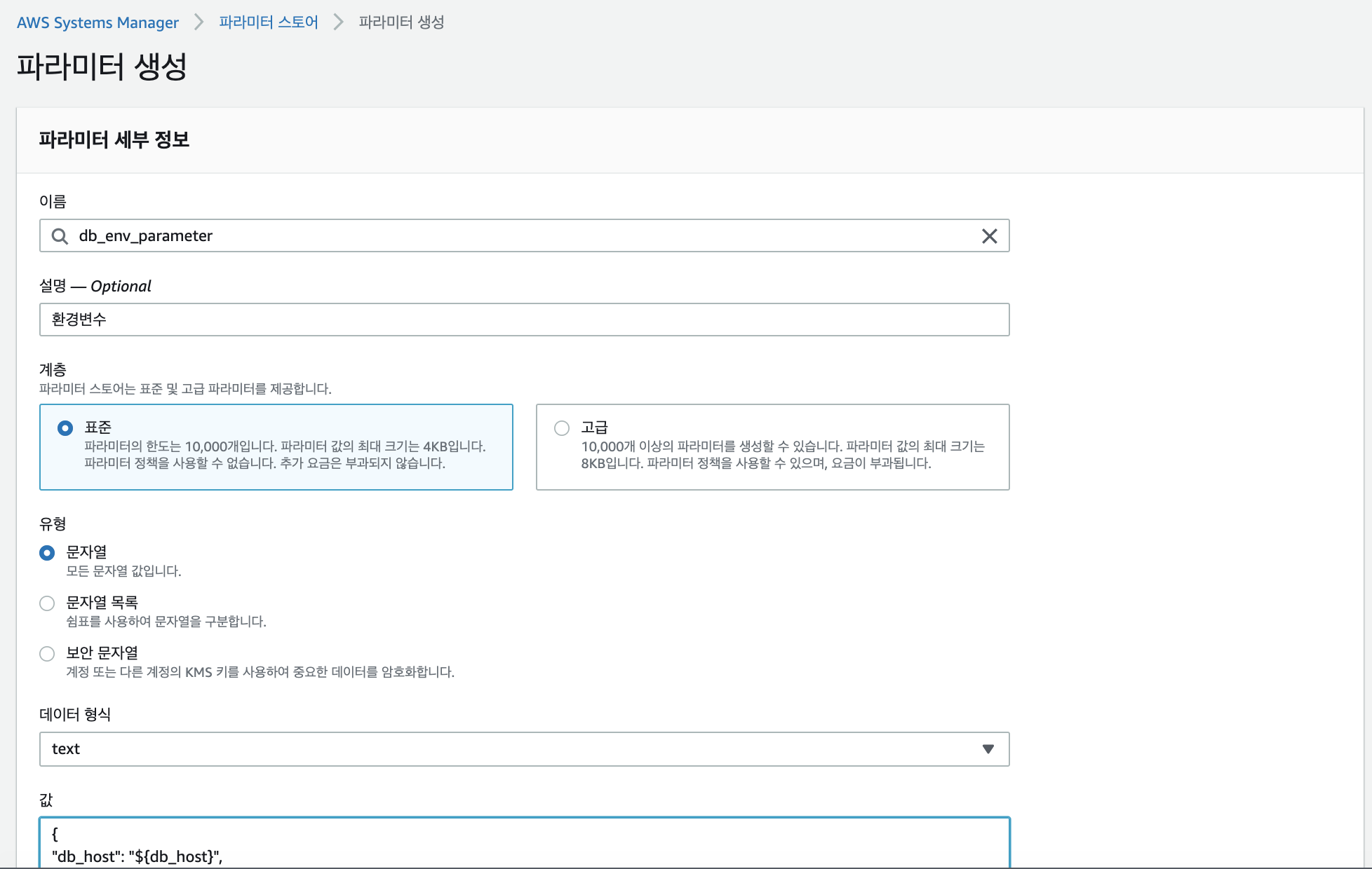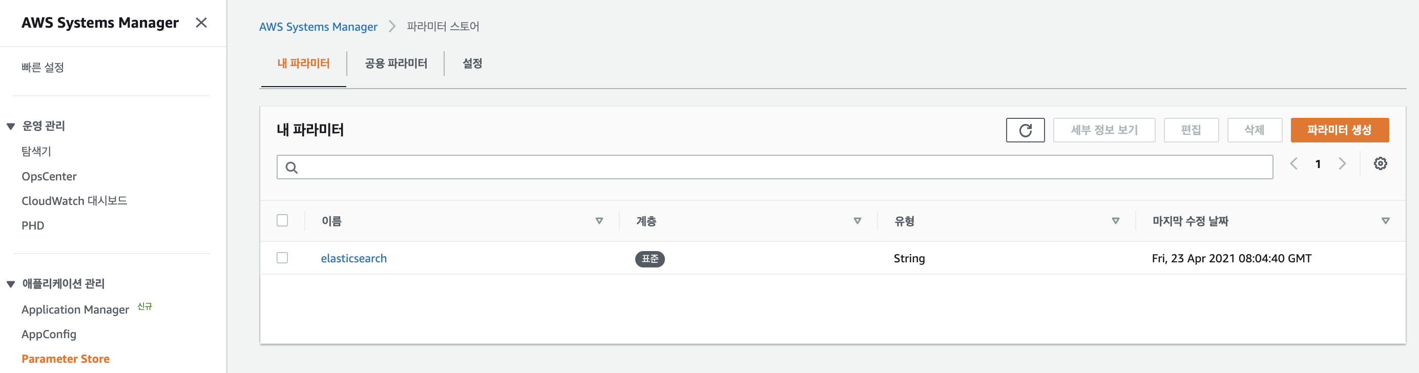 2. 애플리케이션 관리 > [Parameter Store] 을 클릭하고, [파라미터 생성] 버튼을 클릭한다.