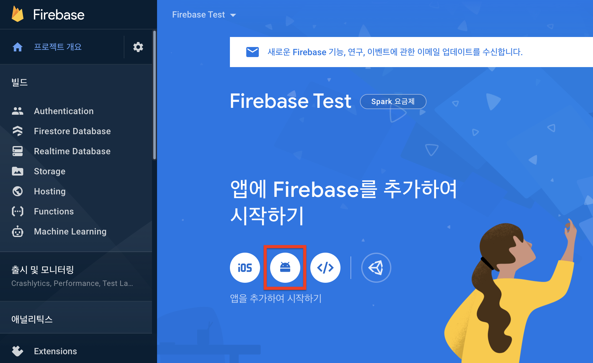 2. Firebase Consle > 안드로이드 아이콘을 클릭한다.