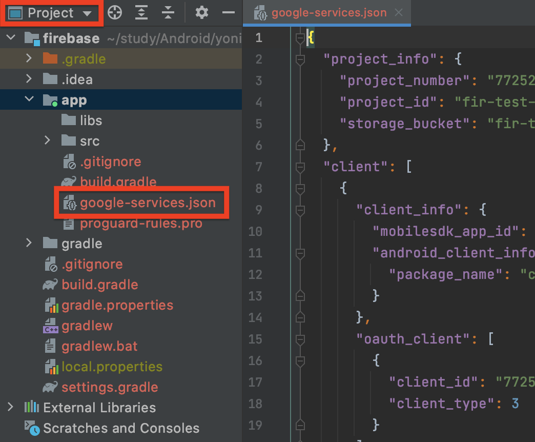 5. 안드로이드 스튜디오 > Project로 변경한 후 4번에서 다운로드 받은 google-services.json 파일을 app 폴더 아래에 넣는다.