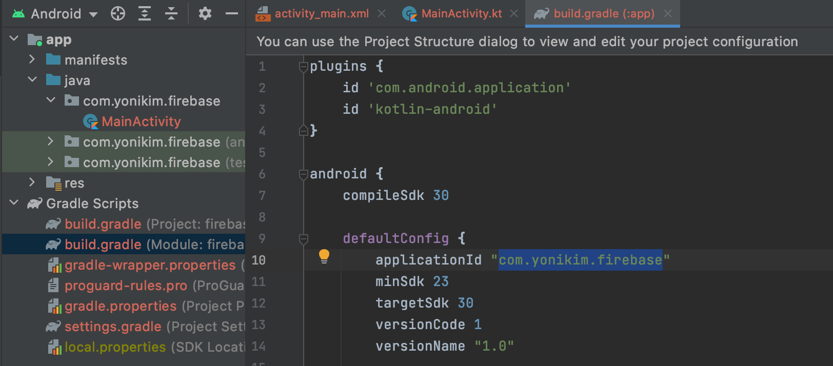 1. 안드로이드 스튜디오 > 앱 수준의 build.gradle 파일에서 applicationId 를 복사한다.