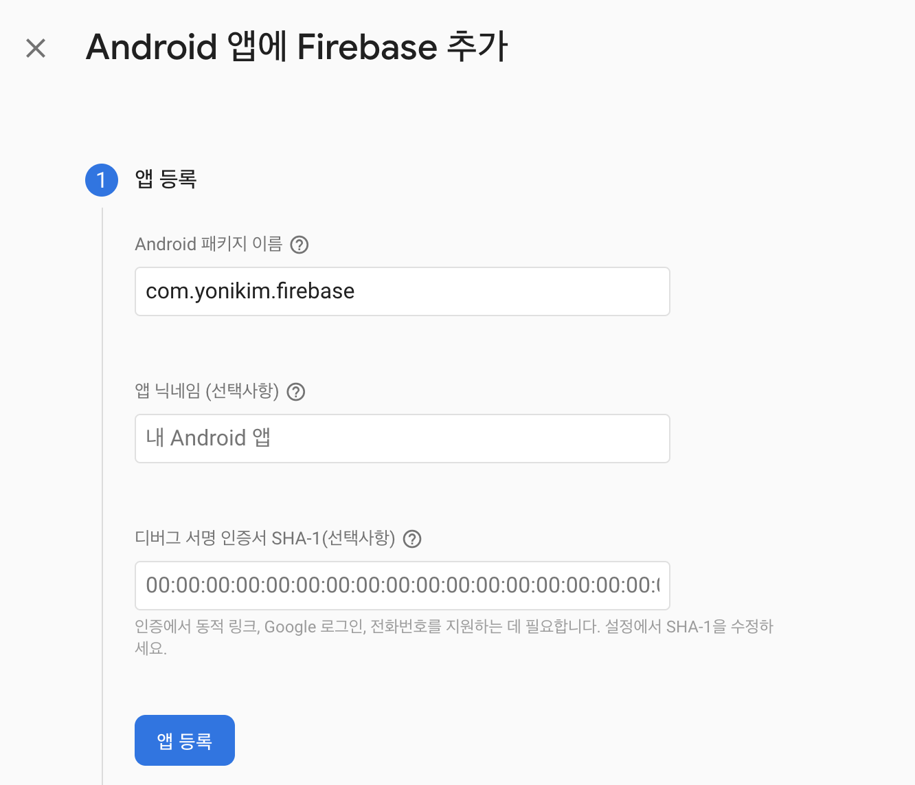 3. Firebase Consle > Android 패키지 이름에 1번에서 복사한 applicationId 를 붙여넣는다.