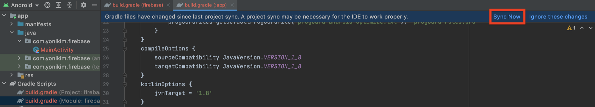 7. 안드로이드 스튜디오 > [Sync Now] 를 클릭한다.