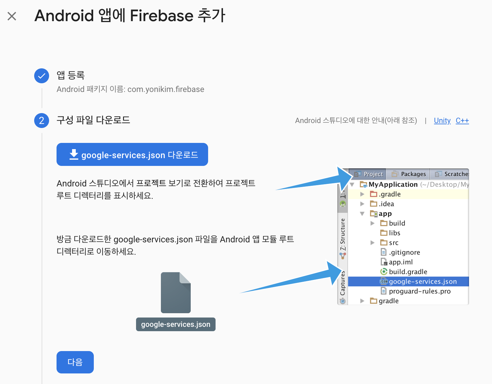 4. Firebase Consle > [google-services.json 다운로드] 버튼을 클릭한다.