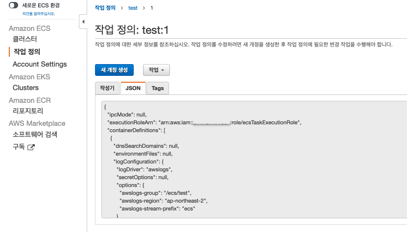 각 설정파일과 관련된 정보들은 ECS > 작업 정의 > 태스크 클릭 > [JSON] 탭에서 가져올 수 있다.