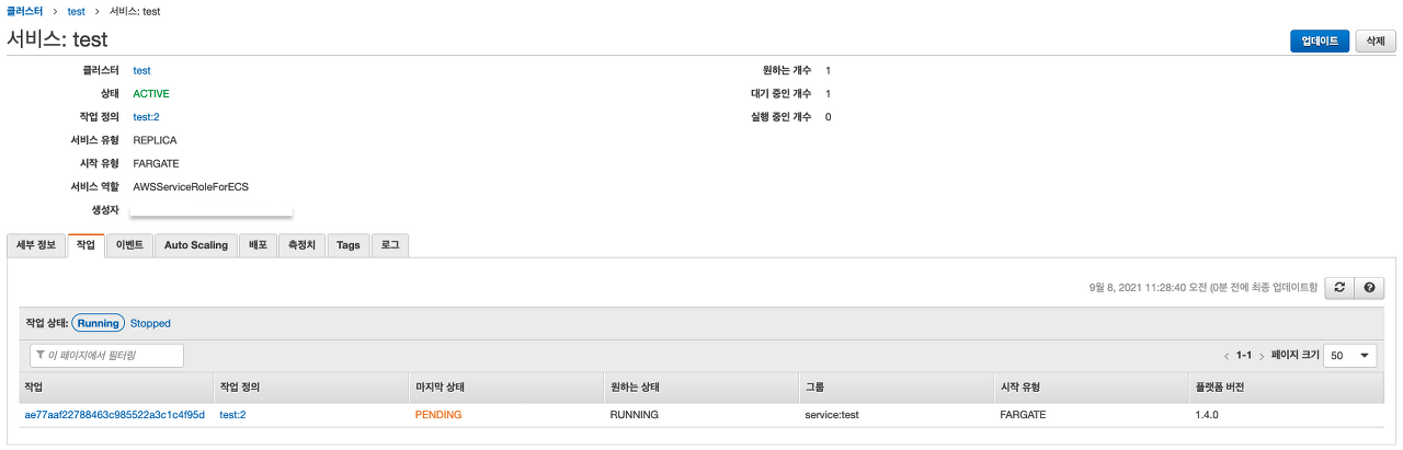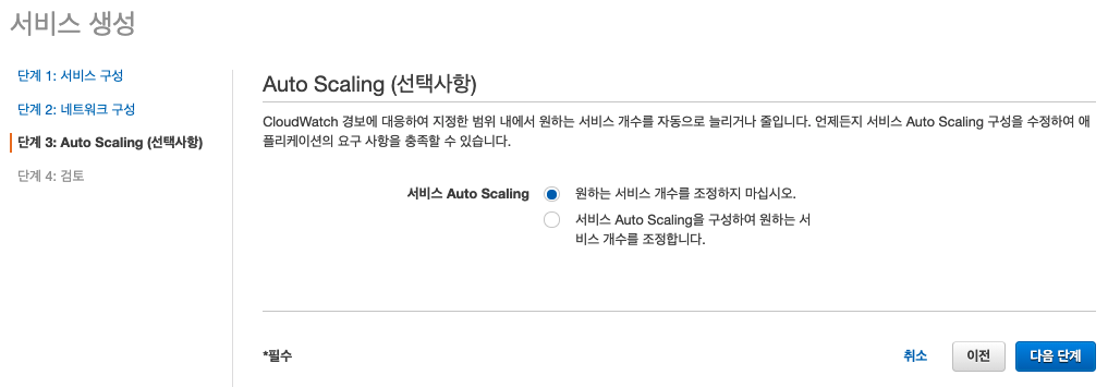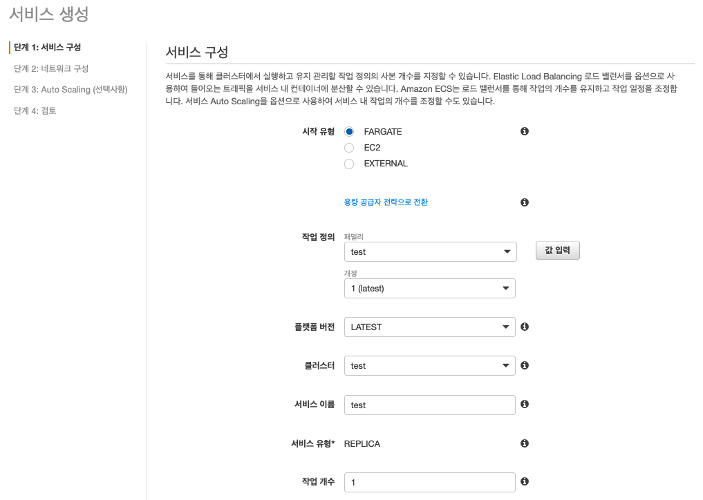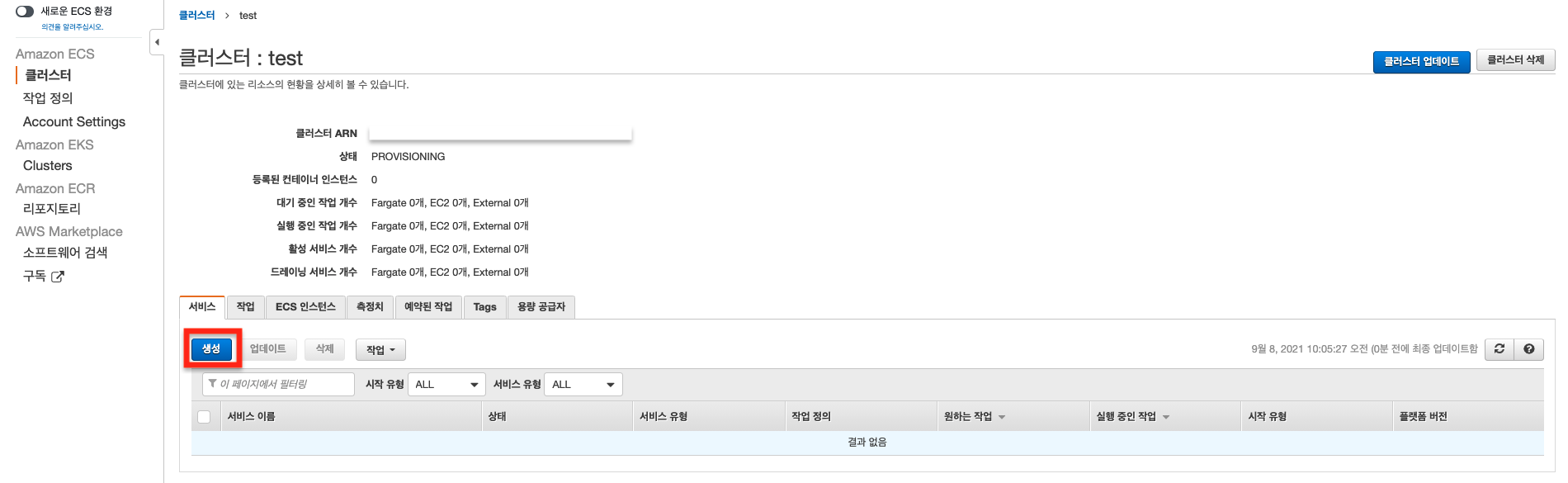 1. 클러스터 > [서비스] 탭 > [생성] 버튼을 클릭한다.