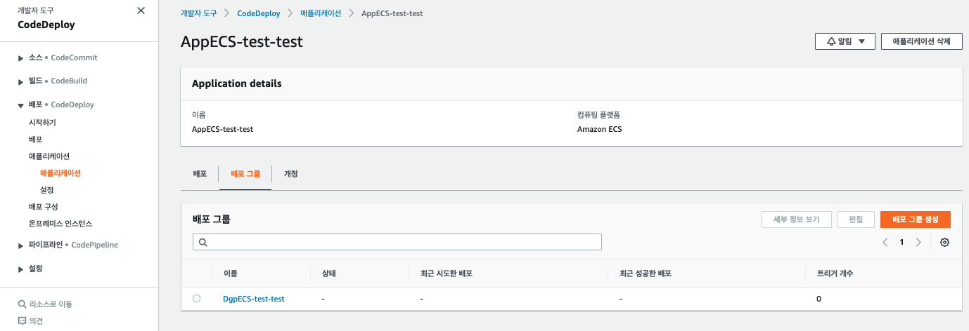 8. 블루/그린 배포의 경우 AWS CodeDeploy 를 이용하여 실행되기 때문에 CodeDeploy > [애플리케이션] 에 가면 아래와 같이 애플리케이션이 자동으로 생성되어 있는 것을 확인할 수 있다.