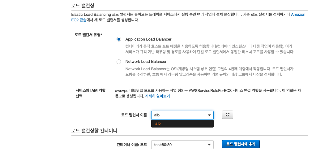 3. 로드 밸런싱에 [ECS] AWS ECS 세팅하기 - 3. 서비스 생성 - 블루/그린 배포 1에서 만든 Application Load Balancer 를 연결한다.