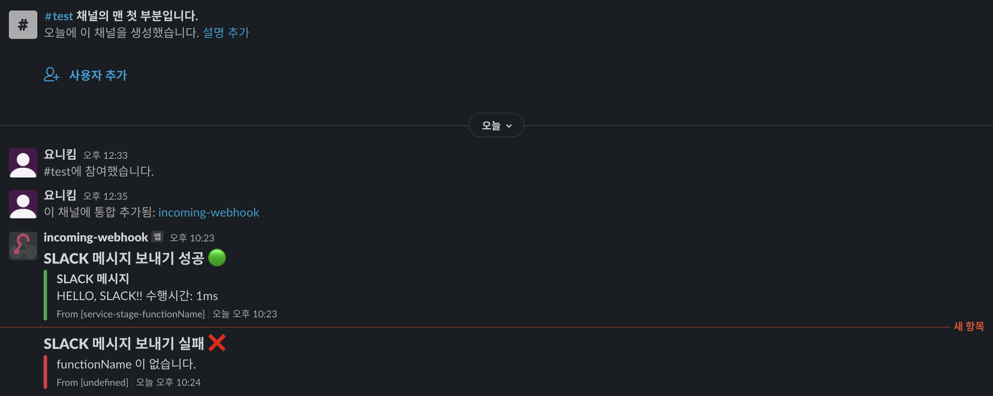 | [Node.js] 웹훅을 이용하여 Slack 에 메시지 전송하기 - 1. 설정하기 (0) | 2021.10.22 |